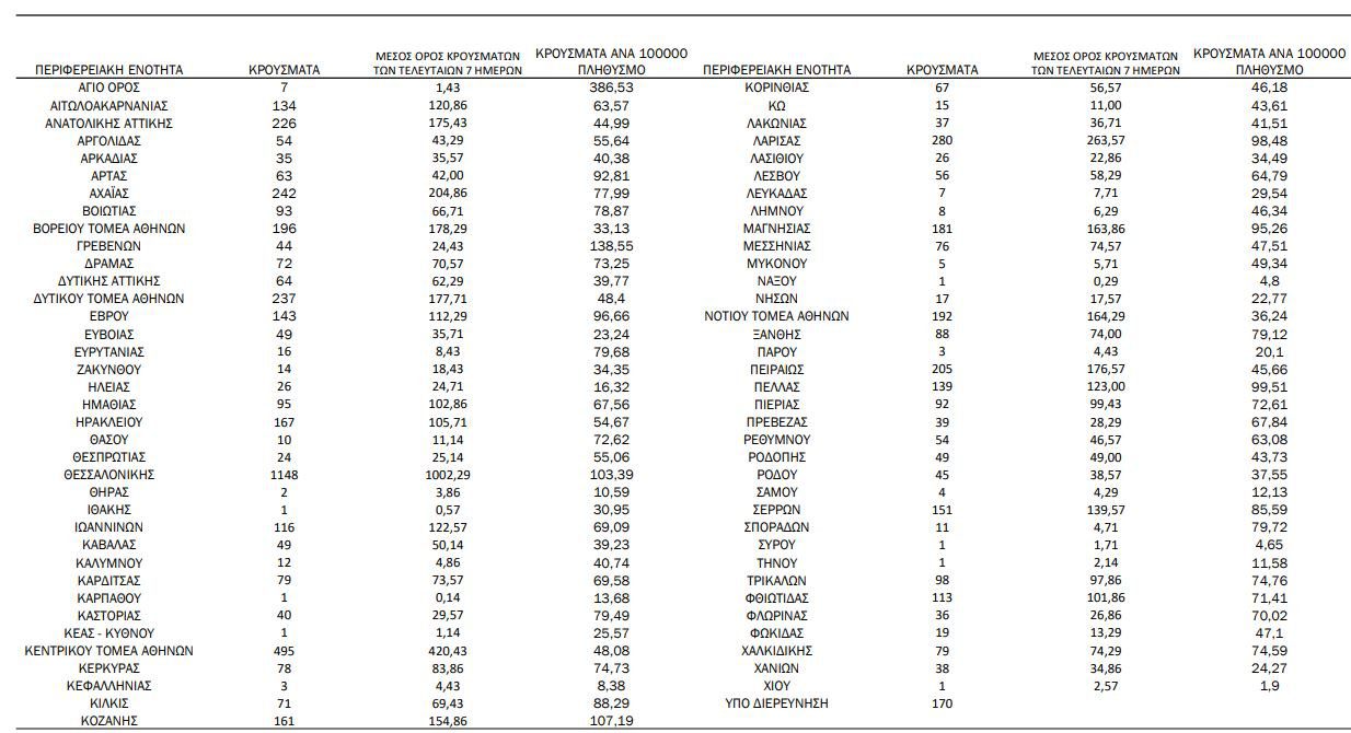 Στην Αττική το τελευταίο 24ωρο εντοπίστηκαν 1.632 νέα κρούσματα και στη Θεσσαλονίκη με 1.148. Ακολουθούν η Λάρισα με 280 και η Αχαία με 242 κρούσματα.