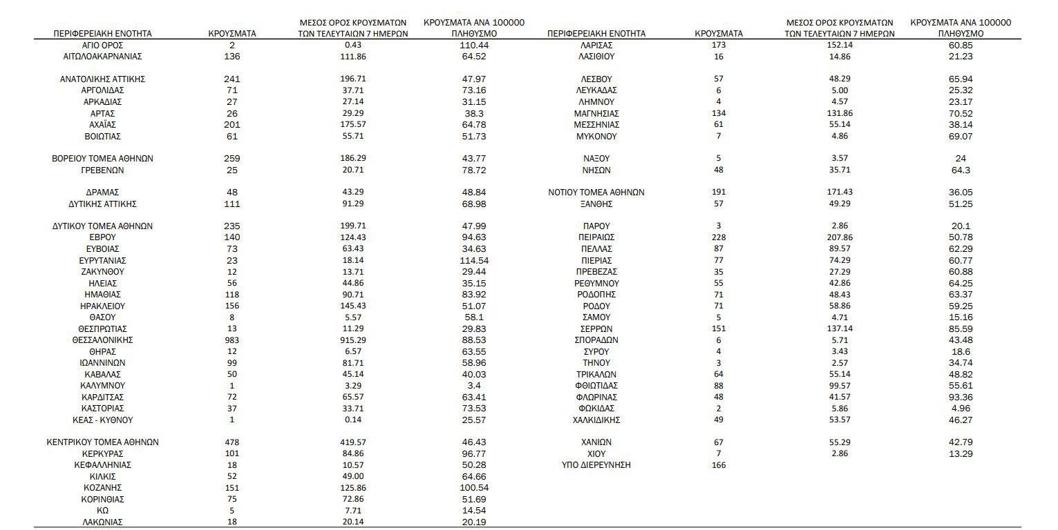 Στην Αττική εντοπίστηκαν 1.791 νέα κρούσματα. Ακολουθούν η Θεσσαλονίκη με 983, η Αχαΐα με 201 και η Λάρισα με 173.