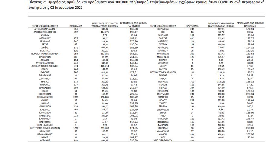 Στην Αττική, το τελευταίο 24ωρο εντοπίστηκαν 6.294 νέα κρούσματα και στη Θεσσαλονίκη, 2.001 νέα κρούσματα. Ακολουθούν Ηράκλειο με 650, Αχαία με 579, Λάρισα με 420, Εύβοια με 366, Κοζάνη με 354 και Χανιά με 325.