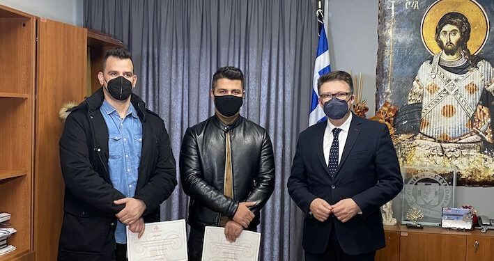 Ο Αντιπεριφερειάρχης Έβρου Δημήτριος Πέτροβιτς τίμησε τους δύο αστυνομικούς του Τμήματος Τροχαίας Αλεξανδρούπολης, οι οποίοι προ ημερών διέσωσαν πολίτη που κινδύνευε από ορμητικό χείμαρρο. Ο κ. Πέτροβιτς επέδωσε «ΕΠΑΙΝΟ» στον Αρχιφύλακα Ανδρέα Τσολάκη και στον Υπαρχιφύλακα Γεώργιο Δεληανδρέα για την ανιδιοτελή προσφορά τους πέραν του υπηρεσιακού καθήκοντος, θέτοντας υπεράνω όλων την προστασία της ανθρώπινης ζωής.