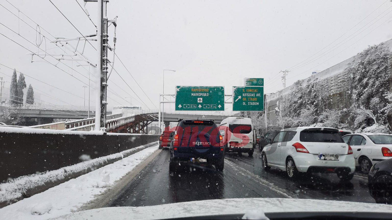 Στην Αττική Οδό και κυρίως στο ρεύμα προς Αεροδρόμιο έχουν σχηματιστεί ουρές χιλιομέτρων από οδηγούς που δεν μπορούν να μετακινηθούν. Επί πολλές ώρες εκατοντάδες οδηγοί βρίσκονται στην Αττική Οδό κάνουν έκκληση για βοήθεια. Πολλοί αναγκάστηκαν να εγκαταλείψουν από το δριμύ ψύχος τα αυτοκίνητα τους και βρήκαν καταφύγιο σε παρακείμενα ξενοδοχεία. Άλλοι βρίσκονται εγκλωβισμένοι και περιμένουν βοήθεια.