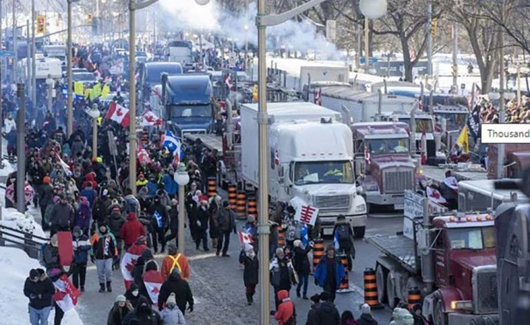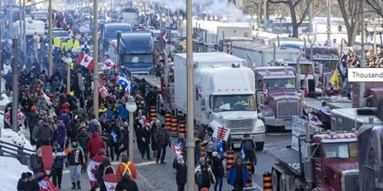 Δεκάδες φορτηγά και άλλα οχήματα απέκλεισαν το κέντρο της Οτάβας από την Παρασκευή και χιλιάδες άνθρωποι κατέβηκαν στον Λόφο του Κοινοβουλίου για να διαμαρτυρηθούν κατά των υγειονομικών μέτρων και του υποχρεωτικού εμβολιασμού κατά της Covid-19 για όσους διασχίζουν τα σύνορα Καναδά-ΗΠΑ.