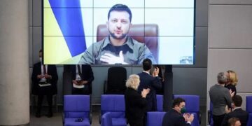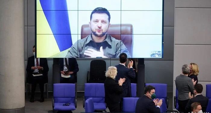 κάλεσε τον γερμανό καγκελάριο ο πρόεδρος της Ουκρανίας Βολοντίμιρ Ζελένσκι, μιλώντας σε τηλεδιάσκεψη στο Ομοσπονδιακό Κοινοβούλιο. Αναφερόμενος σε «τείχος μεταξύ της ελευθερίας και της ανελευθερίας» που δημιουργεί η Ρωσία στην Ευρώπη, ο κ. Ζελένσκι ανέδειξε την ιστορική ευθύνη της Γερμανίας να βοηθήσει προκειμένου να τερματιστεί ο πόλεμος. «Φανείτε ηγέτης και οι απόγονοί σας θα είναι υπερήφανοι για εσάς (…) Τι αξίζει η ιστορική ευθύνη για ό,τι συνέβη πριν από 80 χρόνια; Βοηθήστε μας να σταματήσουμε τον πόλεμο», είπε ο ουκρανός πρόεδρος σε δραματικούς τόνους και οι γερμανοί βουλευτές απάντησαν όρθιοι, με παρατεταμένο χειροκρότημα.
