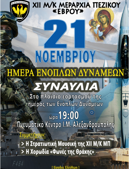 Η ΧΙΙ Μηχανοκίνητη Μεραρχεία Πεζικού <Έβρου> ανακοινώνει ότι στο πλαίσιο του εορτασμού της Ημέρας Ενόπλεων Δυνάμεων, διοργανώνει εκδήλωση με τη συμμετοχή της Στρατιωτικής Μουσικής της Μραρχείας και της χορωδίας “Φωνές της Θράκης” την Τρίτη 21 Νοεμβρίου 2017 και ώρα 19:00, στην αίθουσα του Πνευματικού Κέντρου της Ιεράς Μητρόπολης Αλεξανδρούπολης.