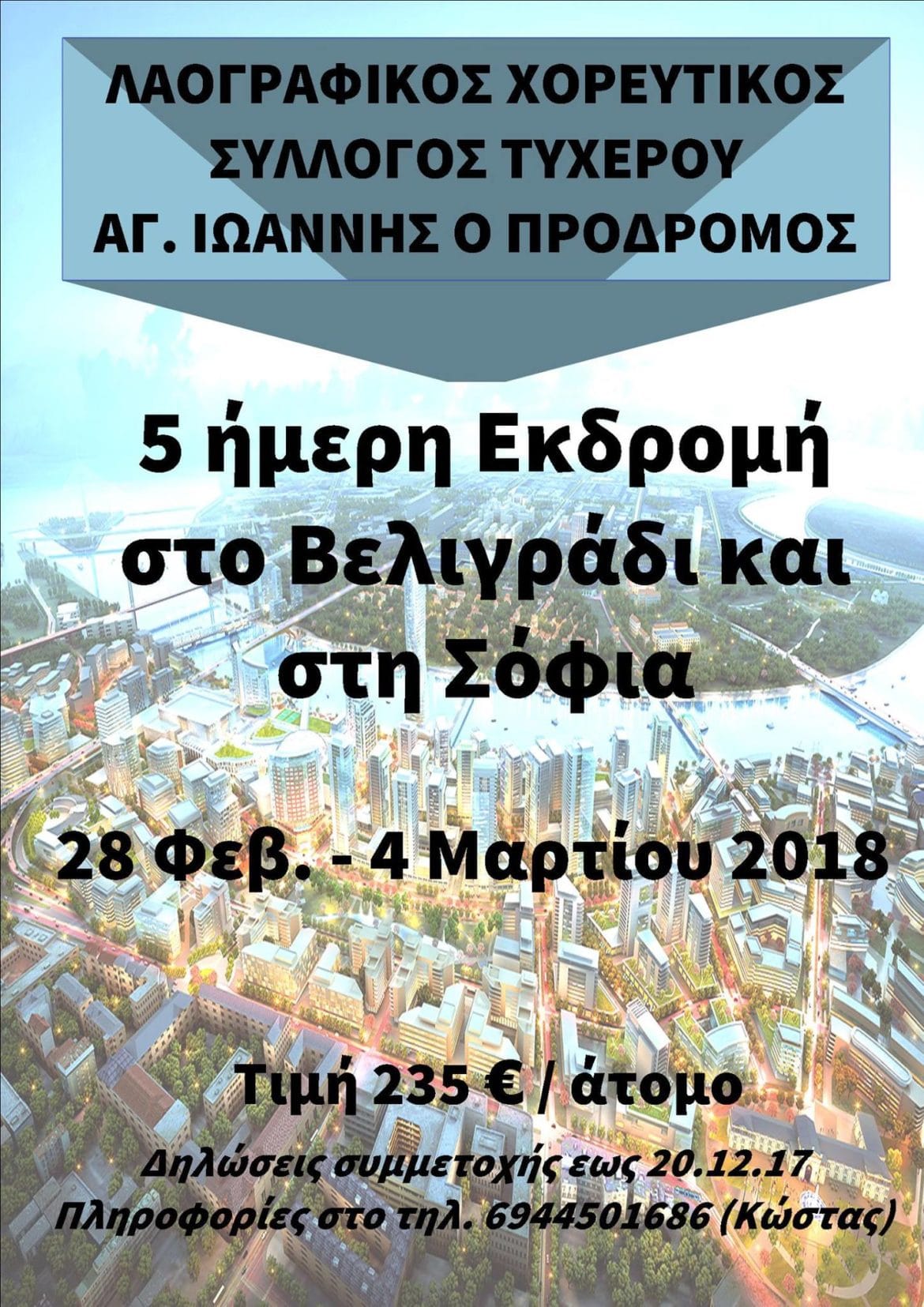 Αγ. Ιωάννης ο Πρόδρομος διοργανώνει 5ήμερη εκδρομή στο Βελιγράδι, στις 28 Φεβρουαρίου 2018 εώς 4 Μαρτίου 2018!!!
