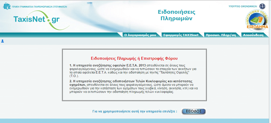Οι ιδιοκτήτες οχημάτων για να εκτυπώσουν το ειδοποιητήριο στο οποίο αναγράφεται ο κωδικός για την πληρωμή των τελών θα πρέπει να εισέλθουν στην ειδική ηλεκτρονική εφαρμογή του Taxisnet, όταν αυτή θα είναι διαθέσιμη.