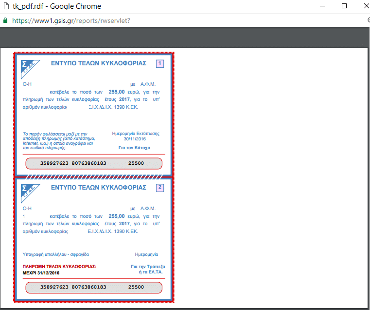 Στην επιλογη “Εκτύπωση Τελών Κυκλοφορίας” μας βγάζει τα τέλη μας