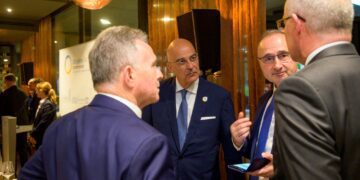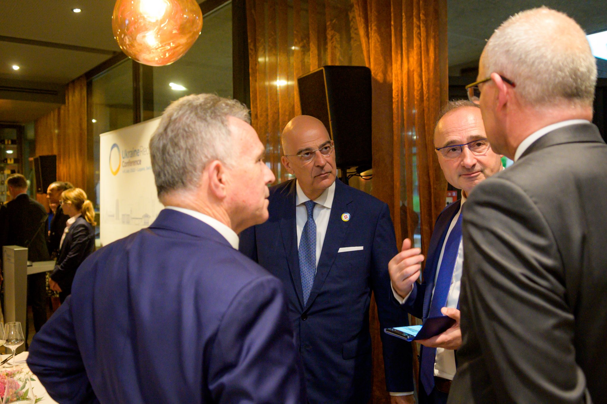 Ο υπουργός Εξωτερικών, Νίκος Δένδιας, συμμετείχε χθες, εκπροσωπώντας τον πρωθυπουργό Κυριάκο Μητσοτάκη, στο δείπνο εργασίας της Διάσκεψης για την ανασυγκρότηση της Ουκρανίας. Στη Διάσκεψη συμμετέχουν αρχηγοί κρατών, κυβερνήσεων και υπουργοί από περίπου 40 χώρες καθώς και εκπρόσωποι από διεθνείς οργανισμούς.