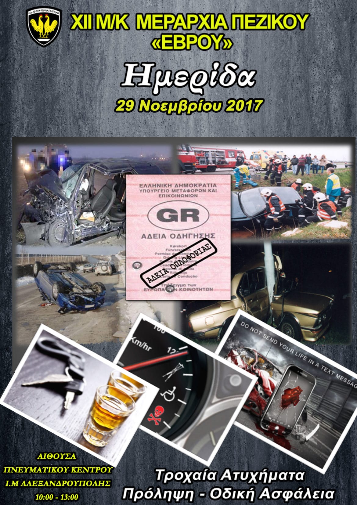 Η ΧΙΙ Μηχανοκίνητη Μεραρχία Πεζικού «ΕΒΡΟΥ» ανακοινώνει ότι θα πραγματοποιηθεί ημερίδα με θέμα «Τροχαία Ατυχήματα», την Τετάρτη 29 Νοε 17 και ώρα από 10:00 έως 13:00, στην αίθουσα του Πνευματικού Κέντρου της