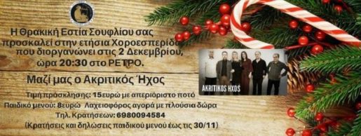 Η Θρακική Εστία Σουφλίου όπως κάθε χρόνο έτσι και φέτος διοργανώνει την ετήσια Χοροεσπερίδα της, στις 2 Δεκεμβρίου με ώρα έναρξης 20:30 στο ΡΕΤΡΟ.