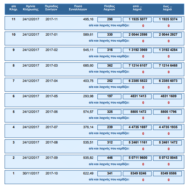 Συνολικά, συμπεριλαμβανομένης της κλήρωσης στις 30 Νοεμβρίου 2017, προέκυψαν 10.963 τυχεροί. Οι 10.930 από αυτούς κερδίζουν από 1.000 ευρώ, 29 κερδίζουν από 2.000 ευρώ και 4 κερδίζουν από 3.000 ευρώ.