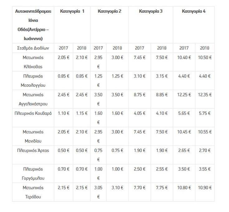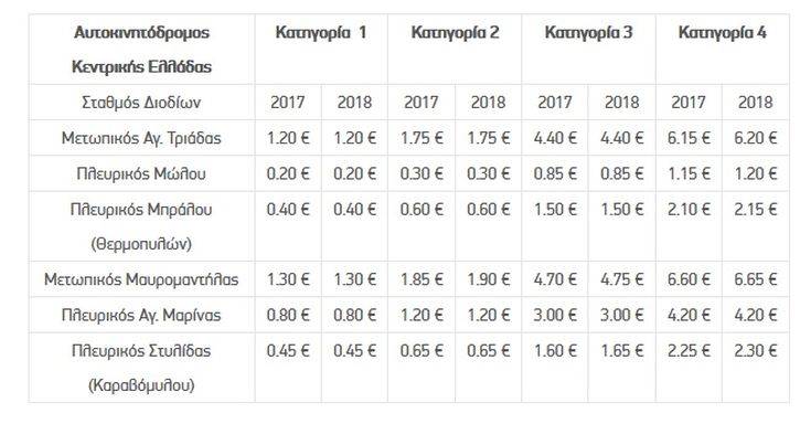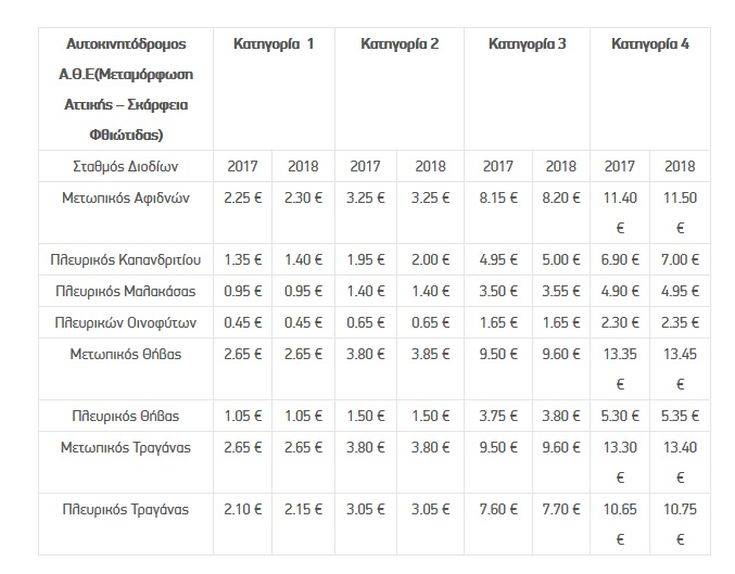 Τα νέα τέλη παρουσιάζονται αναλυτικά ανά αυτοκινητόδρομο, σταθμό διοδίων και κατηγορία οχήματος στους παρακάτω πίνακες. Οι αυξήσεις κυμαίνονται από 5 έως 10 λεπτά του ευρώ ενώ σε πολλούς σταθμούς το αντίτιμο των διοδίων μένει αμετάβλητο.