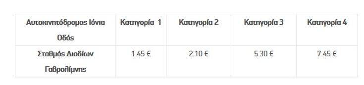 Στην Ιόνια Οδό, τα μεσάνυχτα της Τρίτης 9 Ιανουαρίου προς Τετάρτη 10 Ιανουαρίου (ώρα 00:01) θα ξεκινήσει και η λειτουργία του πλευρικού σταθμού Γαβρολίμνης, με τον οποίο και ολοκληρώνεται το σύστημα χρέωσης του αυτοκινητοδρόμου. Τα διόδια τέλη ανά κατηγορία οχήματος θα είναι τα εξής: