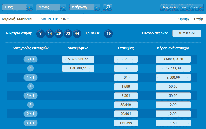 Οι τυχεροί αριθμοί που κληρώθηκαν είναι 8, 14, 29, 33, 44 και Τζόκερ ο αριθμός 15. Δύο υπερτυχερούς που θα πάρουν 2.688.154 ευρώ ο καθένας ανέδειξε η σημερινή κλήρωση του Τζόκερ.