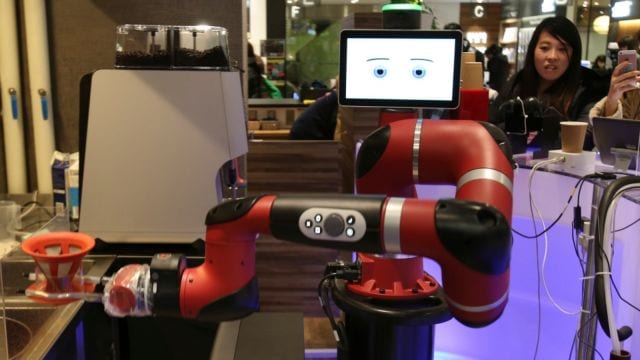Το ρομπότ σκανάρει την «απόδειξη» που έχει πάρει ο πελάτης από μηχάνημα και τον χαιρετά. «Θα θέλατε έναν γευστικό καφέ;» ρωτά η οθόνη με δυο μάτια σαν από καρτούν (το πρόσωπο του μπαρίστα, δηλαδή). «Μπορώ να κάνω καλύτερο καφέ από τους άλλους που κάνουν οι άνθρωποι, εδώ γύρω» διαβεβαιώνει.