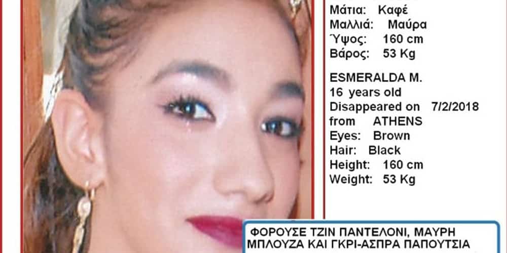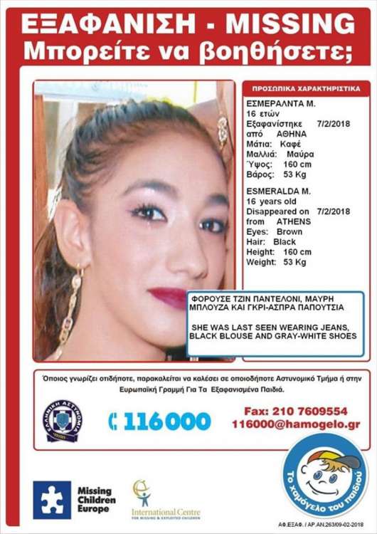 Η 16χρονη ονομάζεται Εσμεράλντα Μ, και χάθηκε την Τετάρτη (07.02.2018) από το σπίτι της στις 19:00 το απόγευμα.