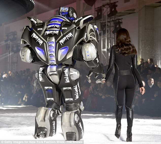 Το εντυπωσιακό μοντέλο εμφανίστηκε στο σκηνικό που θύμιζε διαστημική βάση από έναν ιπτάμενο δίσκο και στο πλευρό της βρέθηκε ένα πελώριο ρομπότ. Πιασμένοι από το χέρι και υπό τους ήχους του «Fly Me To The Moon» περπάτησαν μαζί στην πασαρέλα.