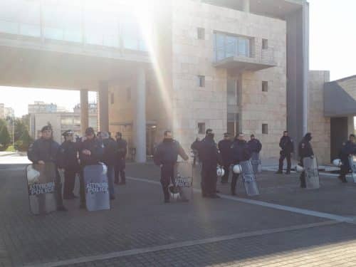 Στο σημείο έχουν παραταχθεί αστυνομικές δυνάμεις προκειμένου να αποτρέψουν την είσοδο των συγκεντρωμένων στο δημαρχείο.