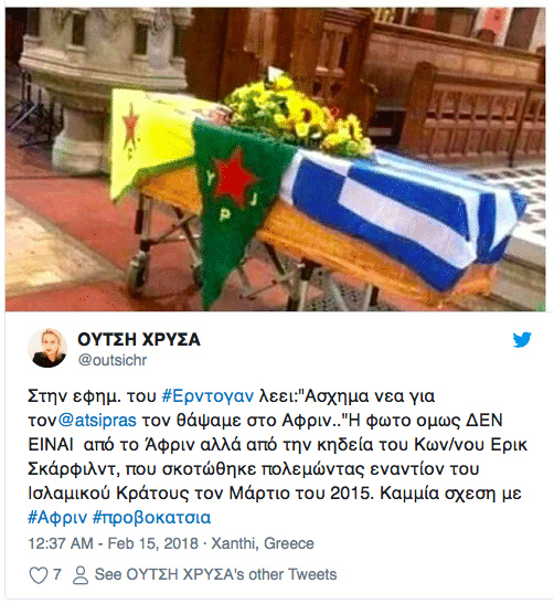 Η εφημερίδα δημοσιεύει φωτογραφία από τη κηδεία Έλληνα που σκοτώθηκε πολεμώντας στο πλευρό των Κούρδων.