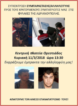 Στηρίζουμε τους διοργανωτές συλλόγους και εκφράζουμε έμπρακτα την αλληλεγγύη μας προς τους κρατούμενους συμπατριώτες μας στις φυλακές της Αδριανούπολης, ως ακολούθως: