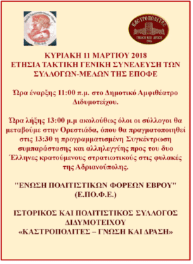 - ΔΙΔΥΜΟΤΕΙΧΟ_Εισαγάγουμε ως έκτακτο θέμα<<Έγκριση του προτεινόμενου -από τους διοργανωτές συλλόγους- Ψηφίσματος Συμπαράστασης στους Έλληνες στρατιωτικούς κρατούμενους στις φυλακές της Αδριανούπολης>>, στο Ανώτατο Διοικητικό Όργανο της Ε.ΠΟ.Φ.Ε. – την Ετήσια Τακτική Γενική Συνέλευση των Συλλόγων-Μελών μας, που φιλοξενεί ο Πολιτιστικός & Ιστορικός Σύλλογος Διδυμοτείχου “Καστροπολίτες-Γνώση & Δράση” στο Δημοτικό Αμφιθέατρο Διδυμοτείχου, την Κυριακή 11/3/2018 και με ώρα έναρξης στις 11:00 το πρωί.