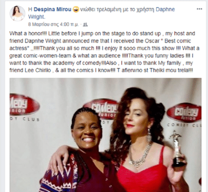 Φανερά συγκινημένη παρέλαβε το «Oscar best stand up comedy» από την Daphne Wright, και αποθεώθηκε από το κατάμεστο κόσμου κλαμπ, ευχαριστώντας τους όλους και δημόσια για την τιμή που της έκαναν.