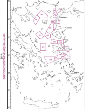 Η Τουρκία δεσμεύει και πάλι (χάρτης Α) τέσσερα πεδία βολής στο κέντρο του Αιγαίου από την Θάσο μέχρι και την Αμοργό, σε μια προσπάθεια να αποκόψει στα δύο το Αιγαίο στη βάση των γνωστών διεκδικήσεων της για επιχειρησιακή διχοτόμηση του αρχιπελάγους στον 25ο μεσημβρινό.