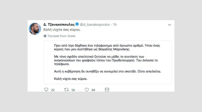 «Πριν από λίγο δέχθηκα ένα τηλεφώνημα από άγνωστο αριθμό. Ήταν ένας κύριος που μου συστήθηκε ως Βαγγέλης Μαρινάκης. Με τόνο σχεδόν απειλητικό ζητούσε να μάθει τον συντάκτη των ανακοινώσεων του γραφείου τύπου του Πρωθυπουργού. Του έκλεισα το τηλέφωνο. Αυτή η κυβέρνηση δεν συνηθίζει να συνομιλεί στο σκοτάδι. Ούτε απειλείται. Καλή νύχτα σας κύριοι».
