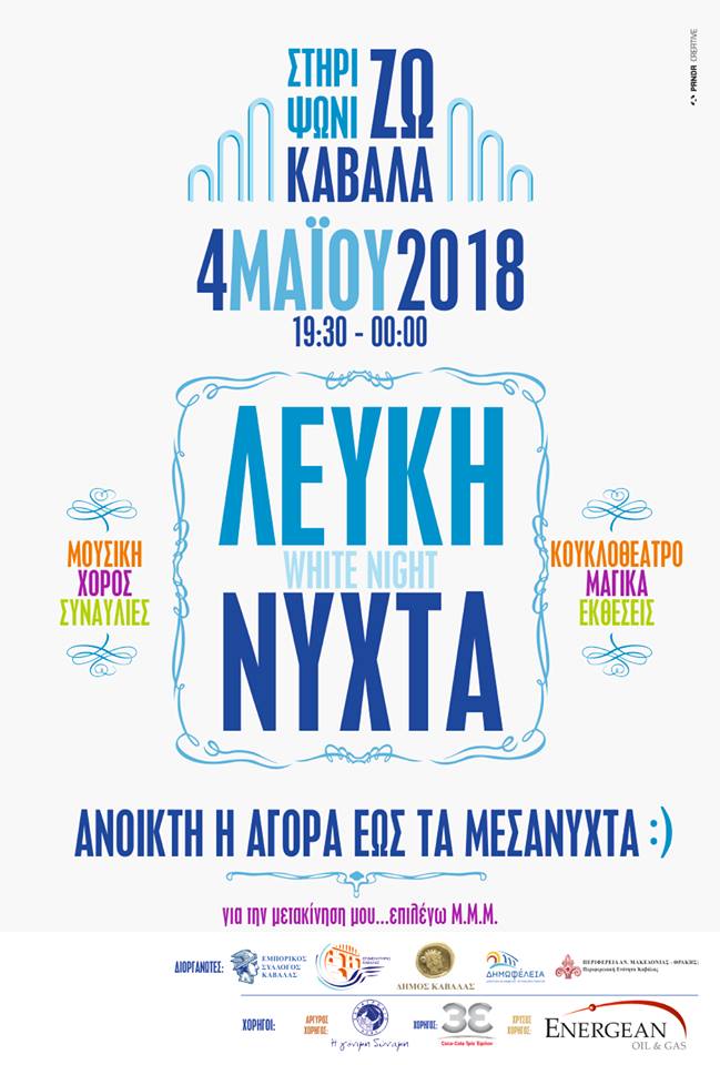 Για 5 η συνεχόμενη χρονιά θα πραγματοποιηθεί την Παρασκευή 4 Μαΐου στην Καβάλα η Λευκή Νύχτα! Η γιορτή της πόλης που έγινε θεσμός από τους επαγγελματίες, από την αγορά, από τους καταναλωτές, από όλους τους πολίτες και από όλους τους θεσμούς!