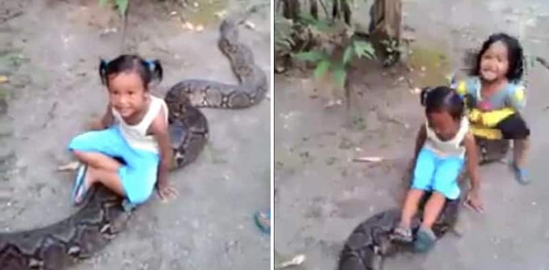 Αλγεινή εντύπωση έχει προκαλέσει η δημοσιοποίηση ενός βίντεο, που απεικονίζει δύο κοριτσάκια προσχολικής ηλικίας να κάθονται και να παίζουν στην ράχη ενός πύθωνα μήκους πέντε μέτρων.