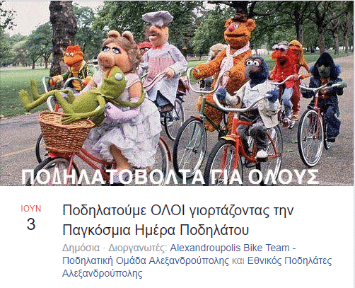Γιορτάζουμε την παγκόσμια ημέρα ποδηλάτου την Κυριακή 03/06 που θεσμοθετήθηκε φέτος από τον ΟΗΕ με μία βόλτα για μικρούς και μεγάλους, για οικογένειες,για παρέες συνολικής διαδρομής περ.30 χλμ σε πολύ χαλαρό ρυθμό για να απολαύσουμε την επαφή με την φύση και να αγαπήσουμε την ποδηλασία. Στα 15χλμ της διαδρομής θα γίνει στάση για ξεκούραση!