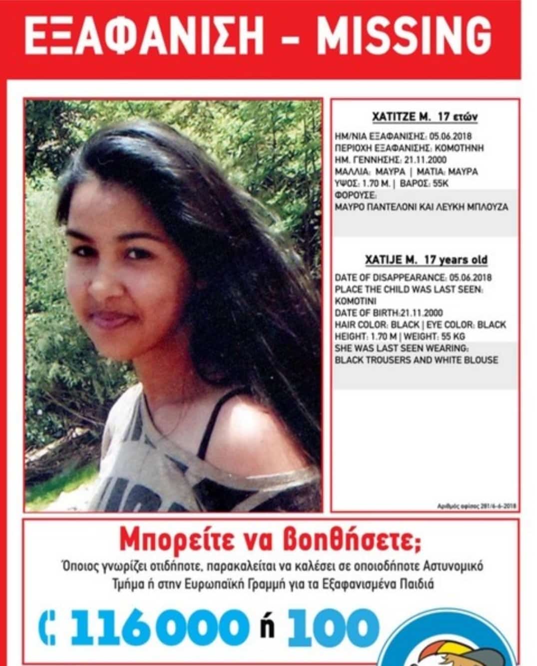Χθες, 5 Ιουνίου και ώρα 07.00, εξαφανίστηκε από την περιοχή του Πολύανθου Ιάσμου Ροδόπης, η Χατιτζέ Μ. 17 ετών. Για την εξαφάνιση της ανήλικης ενημερώθηκε σήμερα Το χαμόγελο του παιδιού και εξέδωσε ανακοίνωση.