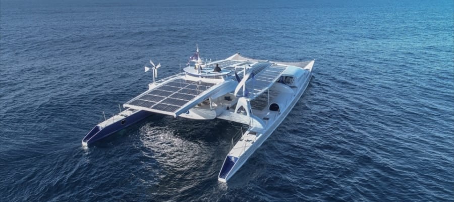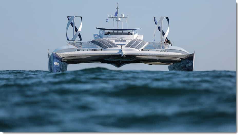 Στη μαρίνα του Φλοίσβου βρίσκεται, από χθες, το πρώτο πλοίο-καταμαράν που κινείται μόνο με Ανανεώσιμες Πηγές Ενέργειας και υδρογόνο, το «Energy Observer». Πρόκειται για ένα πλοίο του μέλλοντος, καθώς κινείται με ηλεκτρικό ρεύμα που παράγεται από ένα μείγμα Ανανεώσιμων Πηγών Ενέργειας και ένα σύστημα παραγωγής υδρογόνου, απαλλαγμένο από το διοξείδιο του άνθρακα, από θαλασσινό νερό.