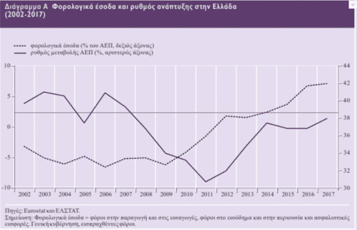 Από το 2015 ως το 2017 όμως τα φορολογικά έσοδα σχεδόν εκτινάχθηκαν, ενώ το ΑΕΠ υποχωρούσε, μέχρι που το 2017 κινήθηκε ξανά εκεί όπου ήταν και το 2014.