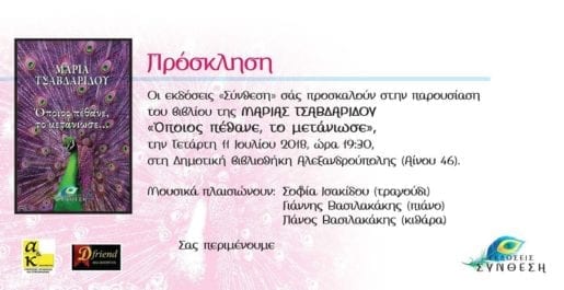 “Όποιος πέθανε το μετάνιωσε”από την Μαρία Τσαβδαριδου και τις εκδόσεις “Σύνθεση “. Τετάρτη 11 Ιουλίου στις 19.30′ στην Δημοτική Βιβλιοθήκη Αλεξανδρούπολης (Αινου 46).