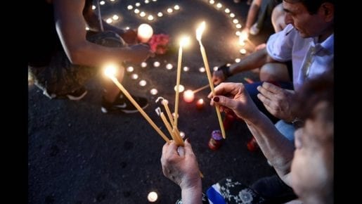 Χρησιμοποιώντας κεριά σχημάτισαν μια καρδιά καθώς και την ημερομηνία της φονικής πυρκαγιάς, πραγματοποιώντας παράλληλα βουβή διαμαρτυρία.