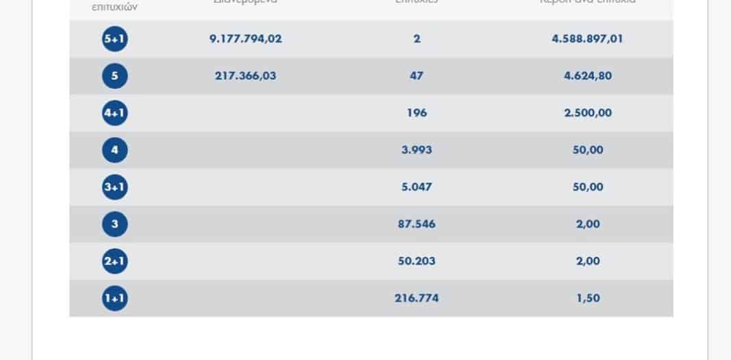 Οι τυχεροί αριθμοί που κληρώθηκαν είναι: 5, 13, 21, 31, 34 και Τζόκερ ο αριθμός 5.