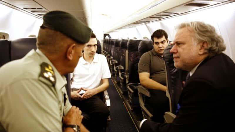 Στο πρωθυπουργικό αεροσκάφος, οι δύο έλληνες στρατιωτικοί, Άγγελος Μητρετώδης και Δημήτρης Κούκλατζης, κατά τις πρώτες στιγμές της απελευθέρωσής τους, περιγράφουν στον αναπληρωτή υπουργό Εξωτερικών, Γιώργο Κατρούγκαλο και τον υπαρχηγό ΓΕΕΘΑ, Κωνσταντίνο Φλώρο τις στιγμές που οδήγησαν στη σύλληψή τους πριν από 5 μήνες.