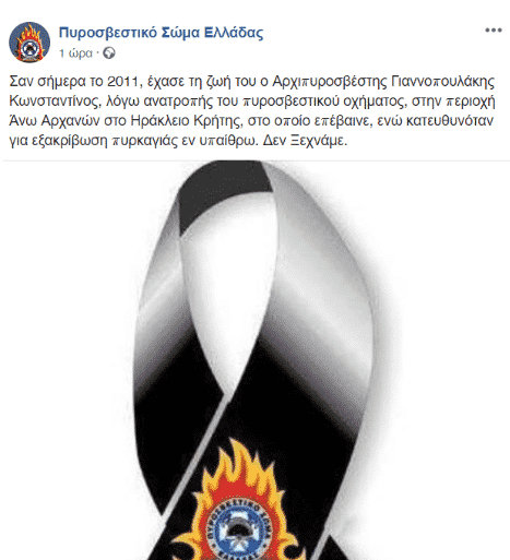Επτά χρόνια από τον θάνατο του Αρχιπυροσβέστη Κωνσταντίνου Γιαννοπουλάκη συμπληρώνονται σήμερα και το Πυροσβεστικό Σώμα έκανε στα social media σχετική ανάρτηση, στη μνήμη του άτυχου άνδρα.