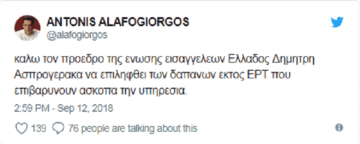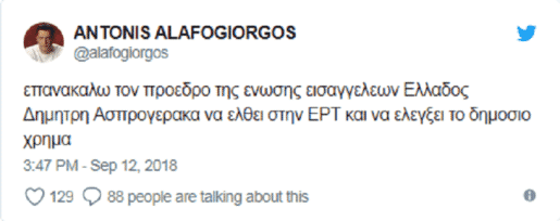 «Καλώ τον πρόεδρο της ένωσης εισαγγελέων Ελλάδος Δημήτρη Ασπρογέρακα να επιληφθεί των δαπανών εκτός ΕΡΤ που επιβαρύνουν άσκοπα την υπηρεσία» έγραψε συγκεκριμένα o Αντώνης Αλαφογιώργος, επαναλαμβάνοντας στη συνέχεια: «Επανακαλώ τον πρόεδρο της Ενωσης Εισαγγελέων Ελλάδος, Δημήτρη Ασπρογέρακα, να έλθει στην ΕΡΤ και να ελέγξει το δημόσιο χρήμα».