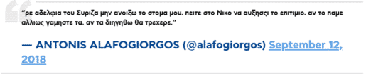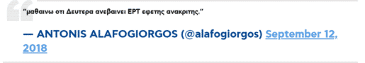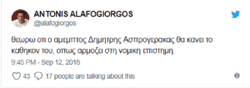 Το τελευταίο «χτύπημα» ήρθε από τον Αντώνη Αλαφογιώργο ο οποίος αρχικά μετέφερε την πληροφορία ότι τη Δευτέρα στην ΕΡΤ «ανεβαίνει εφέτης ανακριτής» και στη συνέχεια επανήλθε στο πρόσωπο του Δημήτρη Ασπρογέρακα γράφοντας «θεωρώ ότι ο άμεμπτος Δημήτρης Ασπρογέρακας θα κάνει το καθήκον του όπως αρμόζει στη νομική επιστήμη».