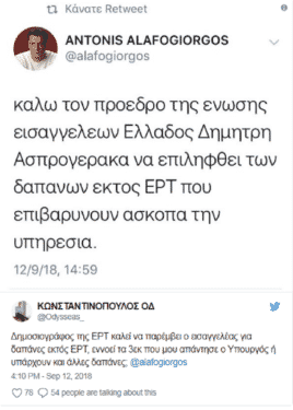 Στο σημείο αυτό, μάλιστα, παρενέβη και ο βουλευτής της Δημοκρατικής Συμπαράταξης Οδυσσέας Κωνσταντινόπουλος, αναδεικνύοντας την καταγγελία Αλαφογιώργου. Δημοσιογράφος της ΕΡΤ καλεί να παρέμβει ο εισαγγελέας για δαπάνες εκτός ΕΡΤ, εννοεί τα 3εκ που μου απάντησε ο Υπουργός ή υπάρχουν και άλλες δαπάνες;» έγραψε σε δική του ανάρτηση ο κ. Κωνσταντινόπουλος.
