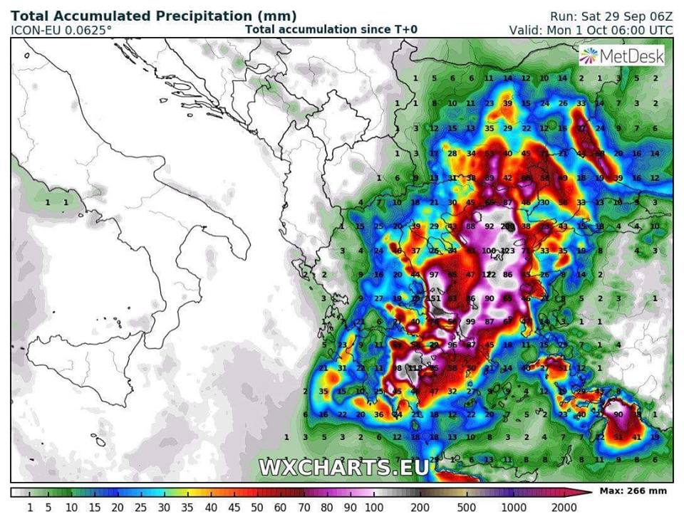 Χάρτης συγκεντρωτικού υετού μέχρι τη Δευτέρα από το ICON. Η Θράκη στο κόκκινο..