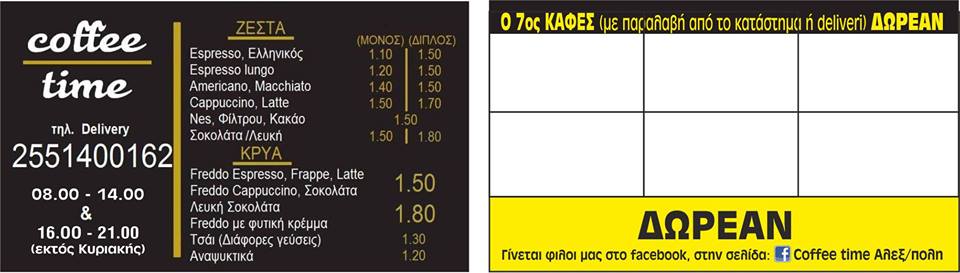 Ένας νέος χώρος δημιουργήθηκε στην Αλεξανδρούπολη, φιλικό και παρεΐστικο, στην οδό Διονυσίου Σολωμού 25 στην παλιά πυροσβεστική απέναντι, το Coffee Time προσφέρει τον καλύτερο καφέ της πόλης και όχι μόνο! Ο χώρος είναι μοντέρνος, με γρήγορο προσωπικό, πάντα στη διάθεσή σας.