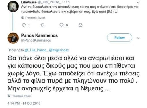 Αίσθηση προκάλεσε η απάντηση του Π. Καμμένου σε παρατήρηση χρήστη του twitter. «Αντί να δυσκολεύετε την αντιπολιτευση και να τους στέλνετε στα δικαστήρια για τα σκάνδαλα, δυσκολεύετε την κυβέρνηση σας. Εγώ αυτό βλέπω» του έγραψε για να απαντήσει ο πρόεδροςτων ΑΝΕΛ σε ύφος που παρέπεμπε στην δήλωση του Παύλου Πολάκη: