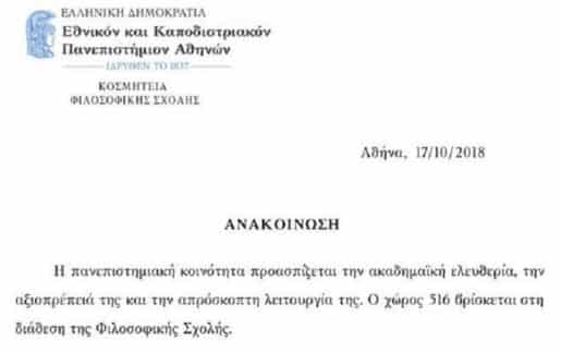 Ο χώρος 516 βρίσκεται στη διάθεση της Φιλοσοφικής Σχολής».