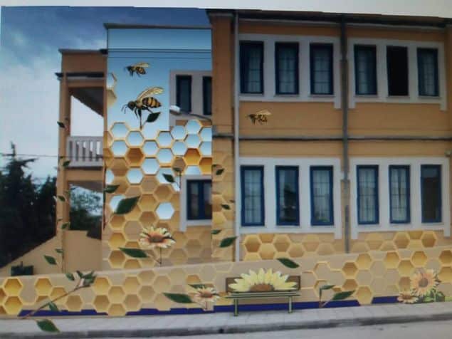 Το βάψιμο ανέλαβε η ομάδα γκράφιτι Mitroulakis Crew και το θέμα που επιλέχθηκε ήταν η κυψέλη που φτιάχνουν οι μέλισσες.