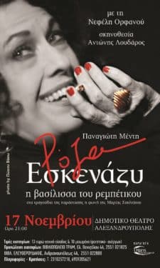 Τη «Ρόζα την ναζιάρα με τα σγουρά μαλλιά» που ήξερε πώς να ξεσηκώνει τα πλήθη. Το «Χαρικλάκι» της, η «Δημητρούλα» της, η «Λιλή την σκανδαλιάρα», το «Ράμπι-Ράμπι» και τόσες άλλες μεγάλες επιτυχίες της που ακούγονται και στην παράσταση μας ταξιδεύουν από την Κωνσταντινούπολη του 1883 μέχρι την Αθήνα του 1980.