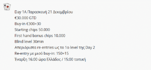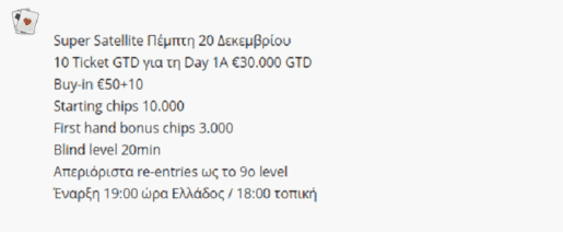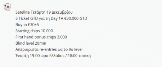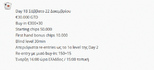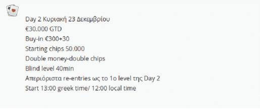 Το επόμενο μεγάλο event του Princess θα διεξαχθεί 19-23 Δεκεμβρίου και περιλαμβάνει δύο satellites και το Main Event, ενώ το gtd των €30.000 που ανακοινώθηκε αφορά αποκλειστικά το Main Event! Τα δύο satellites θα δώσουν 15 θέσεις συνολικά, με 5 θέσεις gtd να μοιράζονται στο satellite της Τετάρτης 19 Δεκεμβρίου και άλλες 10 θέσεις gtd στο Super Satellite της Πέμπτης.