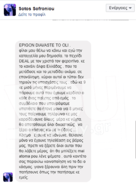 «Φίλοι μου θέλω να κάνω και εγώ την καταγγελία μου. Το παιχνίδι DEAL με τον Χρήστο Φερεντίνο και το κανάλι Άλφα Ελλάδας, που το μετέδωσε και το μεταδίδει ακόμα σε επανάληψη, κύριοι αυτοί οι τύποι δεν τηρούν τις υποσχέσεις τους . Εδώ και 9 και μισό μήνες περιμένουμε να πάρουμε αυτά που έχουμε κερδίσει ο κάθε ένας παίχτης από εμάς . Το συμβόλαιο που υπογράψαμε υποτίθεται θα ήταν μόνο για 8 μήνες! Τους παίρνουμε τηλέφωνο και μας κοροϊδέυουνε όλους, μέρα και νύχτα. Θα αποταθούμε όλοι δικαστικώς . Να ξέρει ο κόσμος και με τι είδους … Κόσμο έχουνε να κάνουνε. Θέλουνε μόνο να έχουνε τηλεθέαση εις βάρος μας. Πρέπει να ξέρετε όλοι αυτοί που θα λάβετε μέρος ότι θα μπλέξετε με άτομα που λένε ψέματα . Αυτό καντέ το σας παρακαλω κοινοποίηση να το δει ο κόσμος. για να ξέρουν όλοι πριν την πατήσουν όπως την πατήσαμε κι εμείς!»